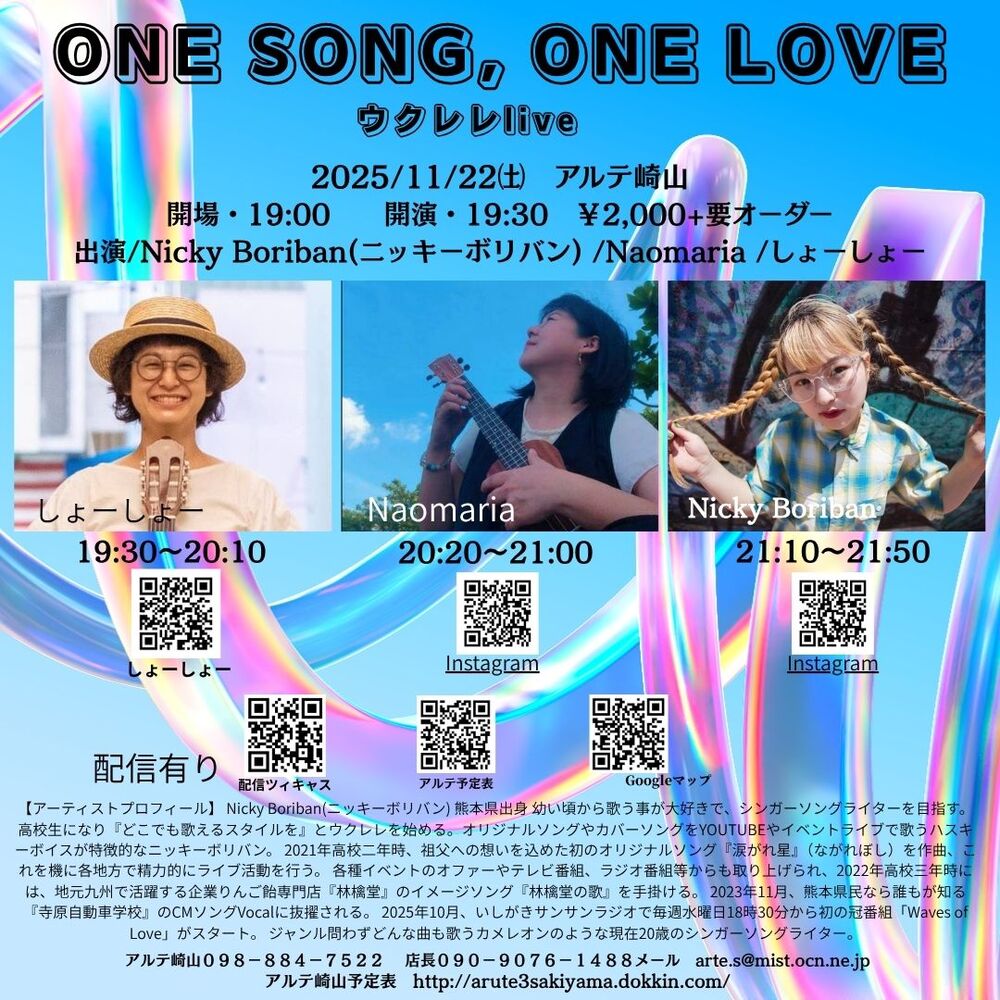 高校生になり『どこでも歌えるスタイルを』とウクレレを始める。オリジナルソングやカバーソングをYOUTUBEやイベントライブで歌うハスキーボイスが特徴的なニッキーボリバン。