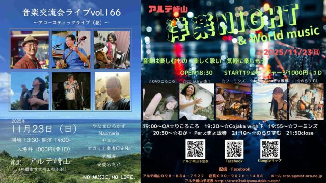 ①「音楽交流会ライブvol.166〜アコースティックライブ〜」②洋楽NIGHT & WorldMusic
