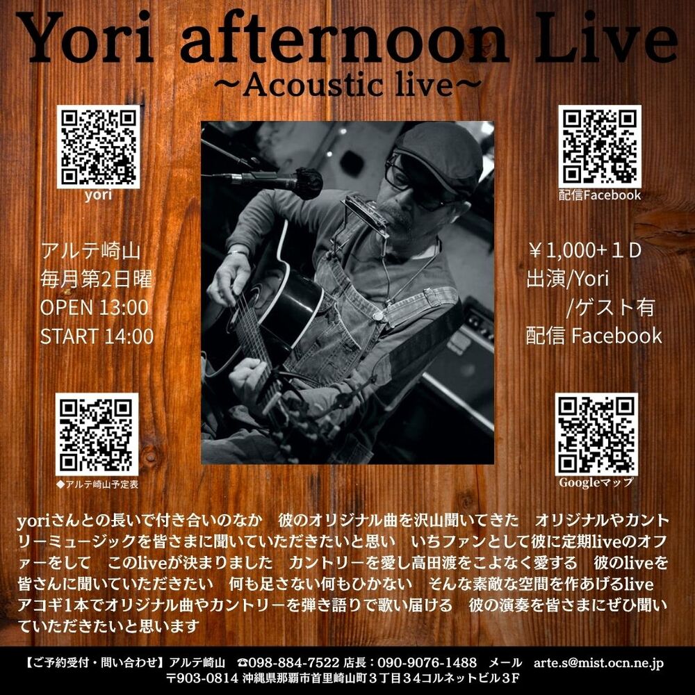 yoriさんとの長いで付き合いのなか 彼のオリジナル曲を沢山聞いてきた オリジナルやカントリーミュージックを皆さまに聞いていただきたいと思い いちファンとして彼に定期liveのオファーをして このliveが決まりました カントリーを愛し高田渡をこよなく愛する 彼のliveを皆さんに聞いていただきたい 何も足さない何もひかない そんな素敵な空間を作あげるlive アコギ1本でオリジナル曲やカントリーを弾き語りで歌い届ける 彼の演奏を皆さまにぜひ聞いていただきたいと思います