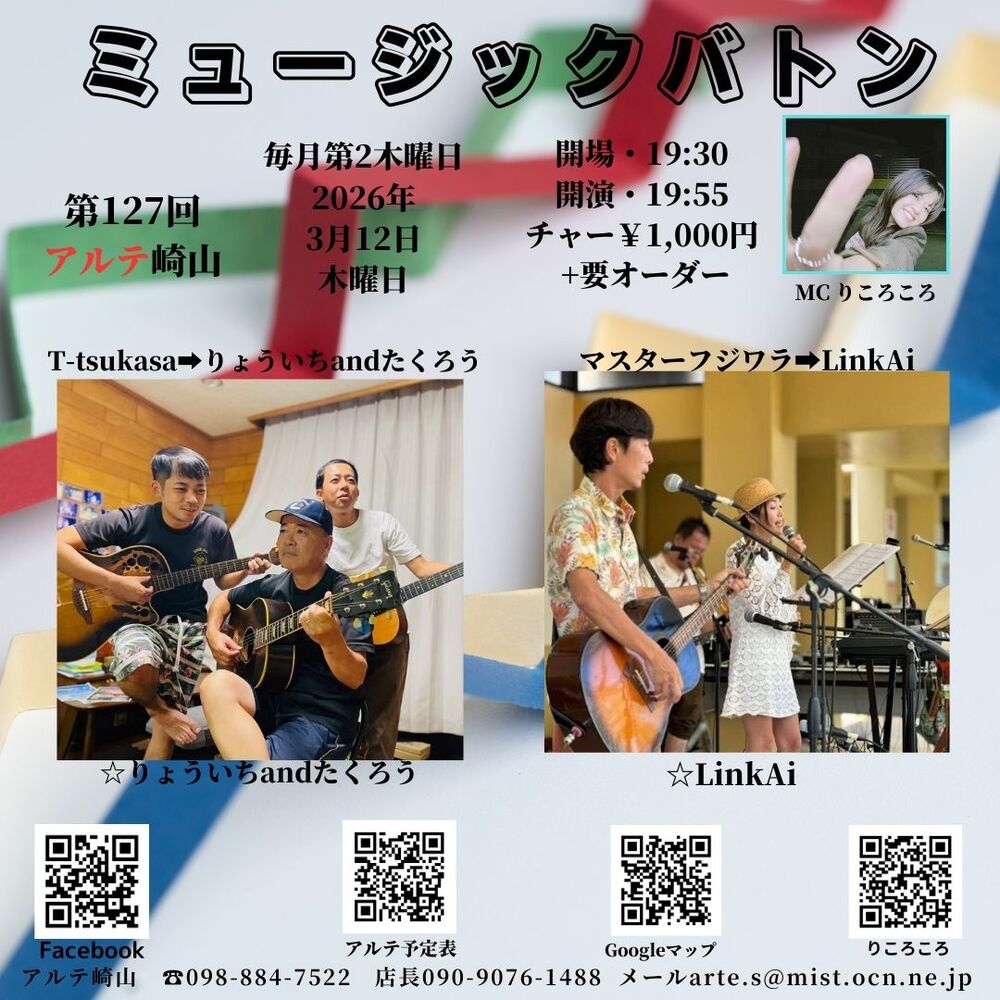 ※アルテ崎山は弾き語りをメインですので出来る限り アコースティックの弾き語り・バンドの方へのバトンよろしくお願いします